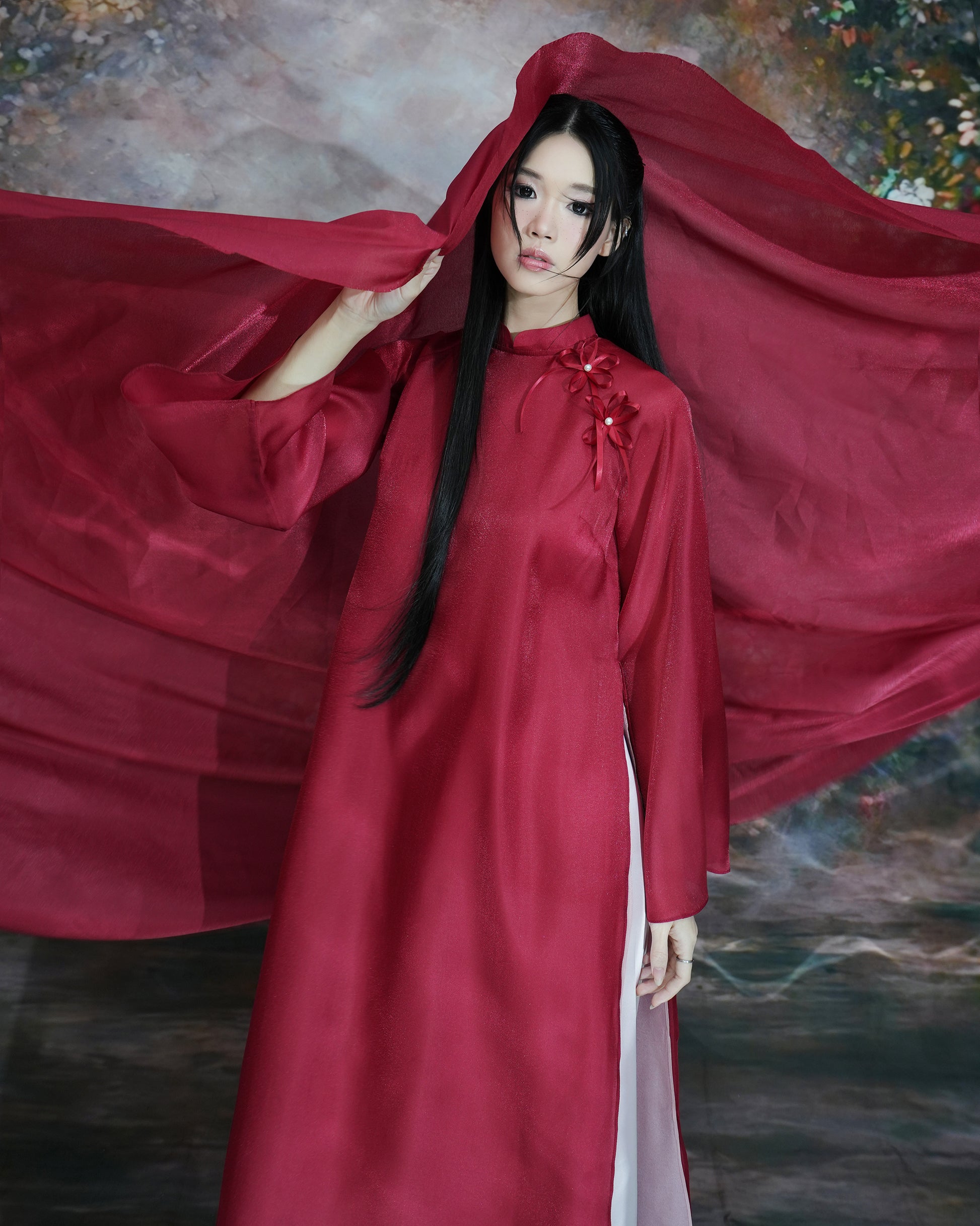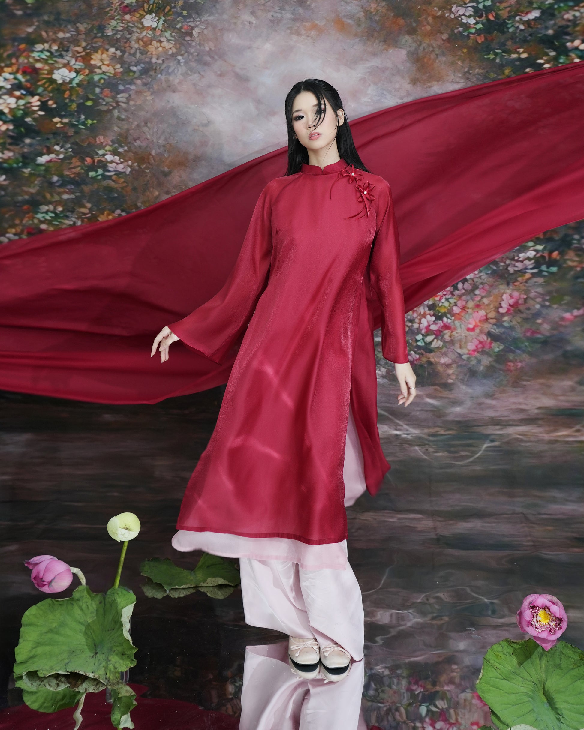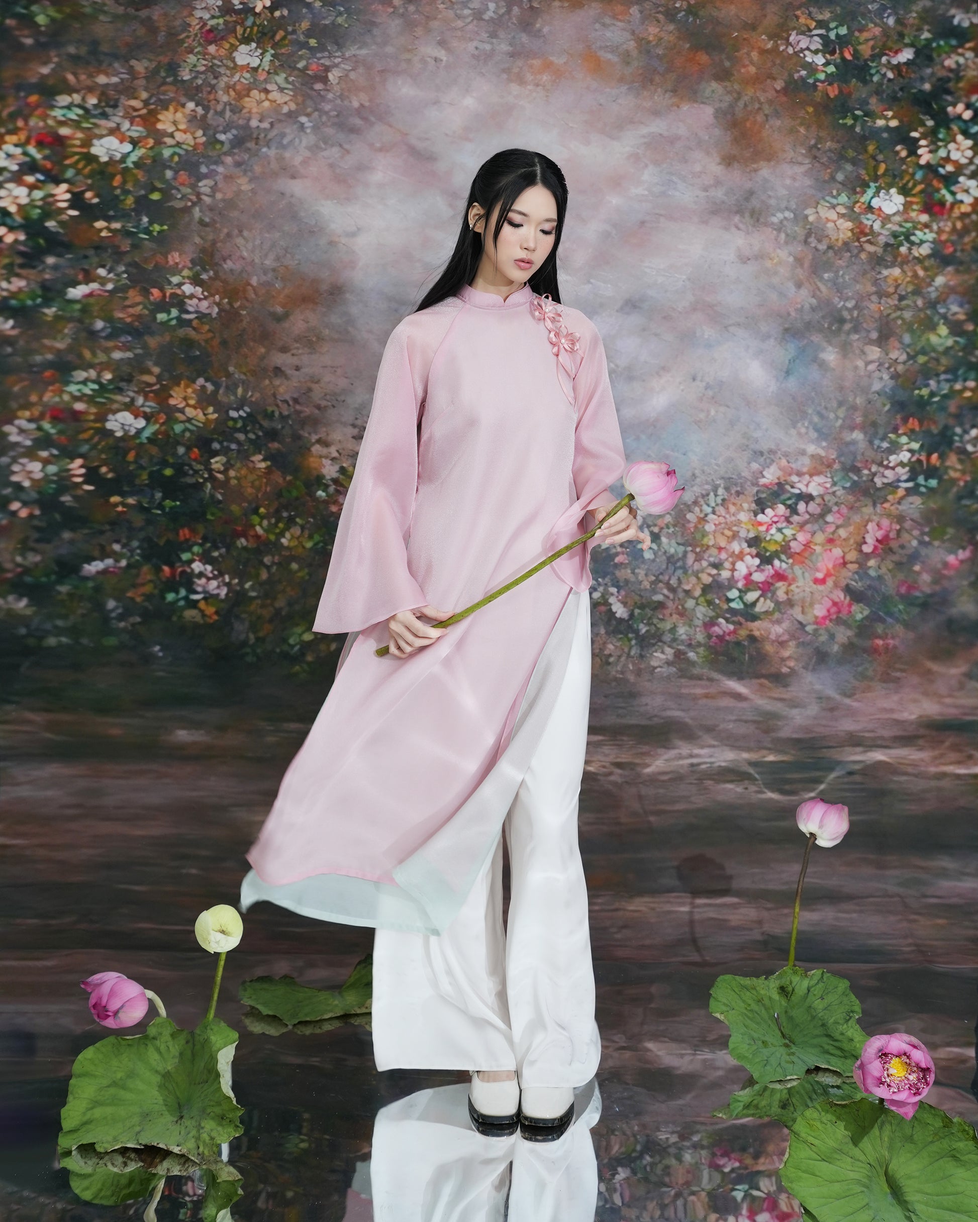 - Product details: DALLA Combo 2-layer silk Ao Dai (Vietnamese traditional dress) with round neck and floral print + Wide-leg pants (ADT02+Q09)