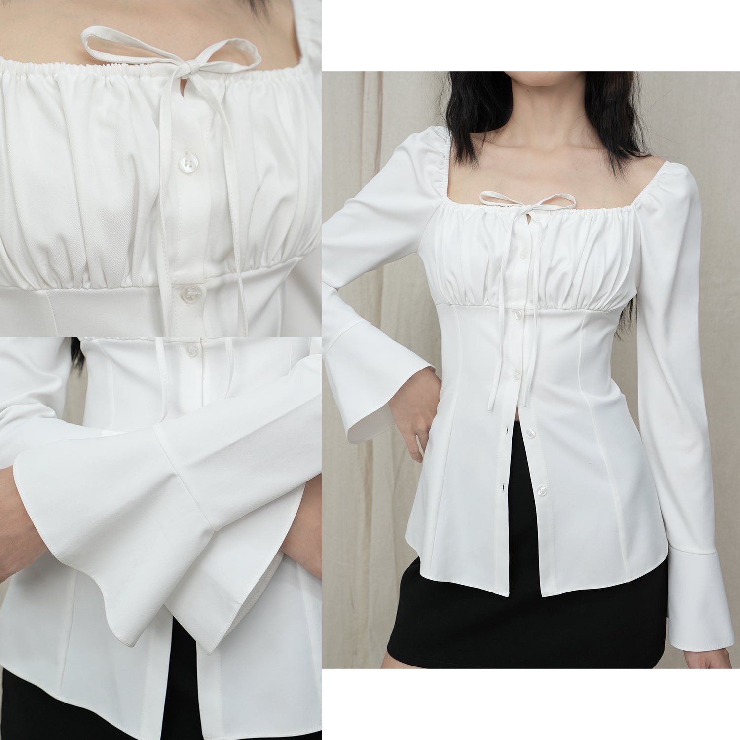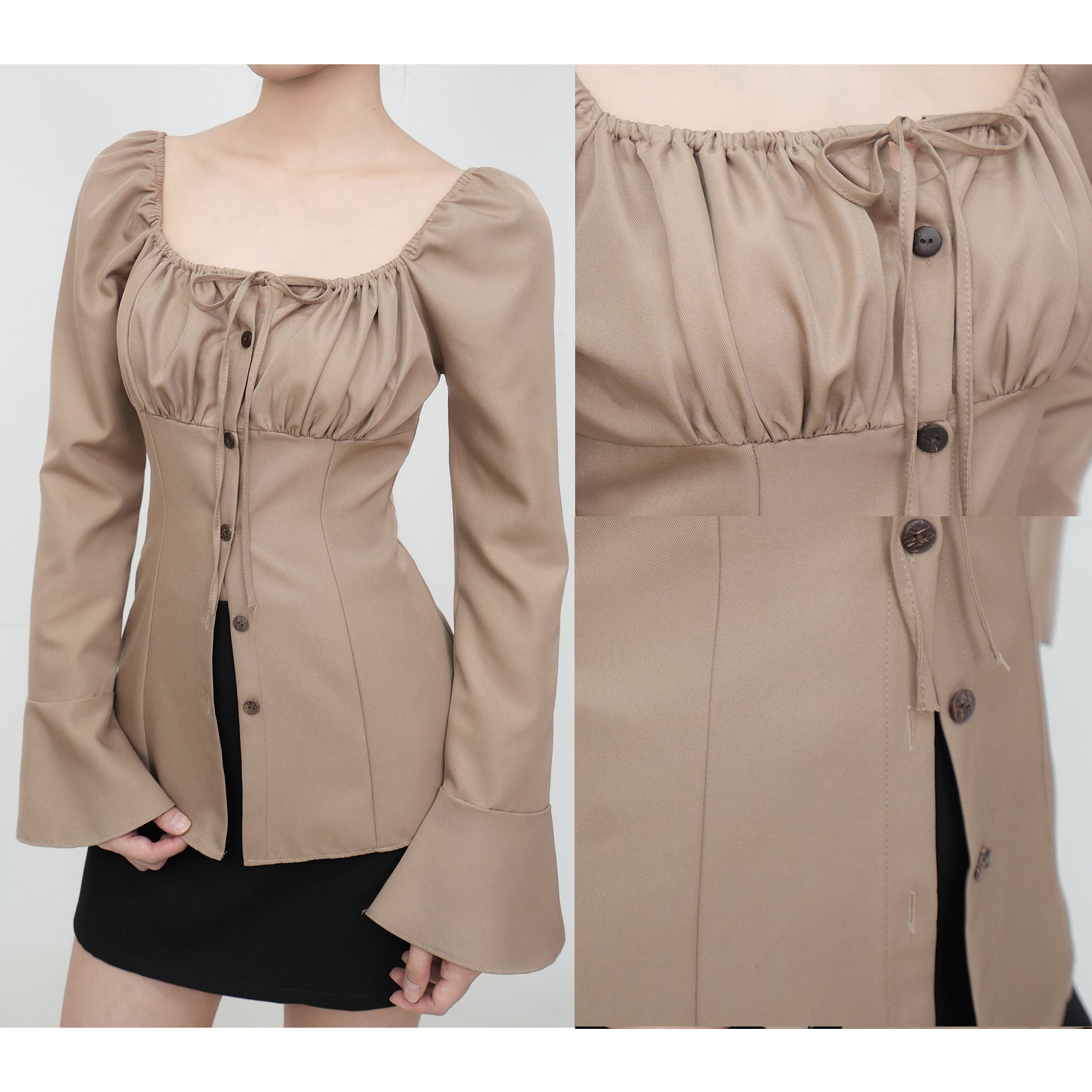 - Chi tiết sản phẩm: Sơ mi cổ vuông tay loe nhún ngực DALLA